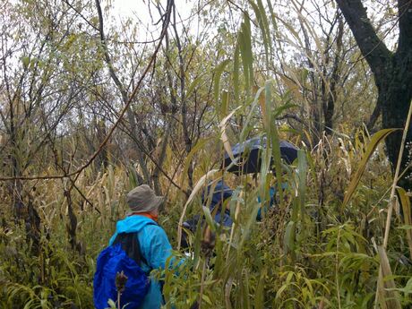 草をかき分け10mも進むと、木のある所はなんと水浸し、石狩川が氾濫してあたりは一面泥水だらけ・・・・・・。水の無い高い場所をあちこち探したが、ダメでした。ヌメリスギタケモドキ、ムラサキシメジ、ツチスギタケ、チャワンタケが見られた。1週間後に再度チャレンジすることにして、早めに解散。 (記:松原 写真:池ノ谷)