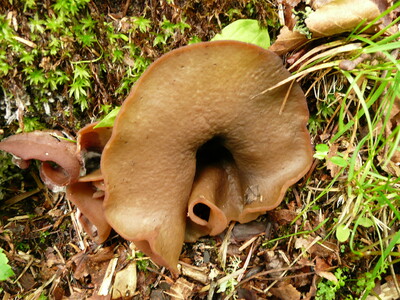 高橋郁雄先生からのご提供。小型菌「偽茶碗茸」和名。柄がない椀状で一部が切れ込んで底まで裂けて不正形