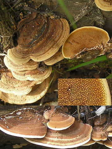 傘は直径1~5cm程で半円形。表面は淡橙黄色~茶褐色、初め短毛が密でビロード状、明瞭な環紋がある。