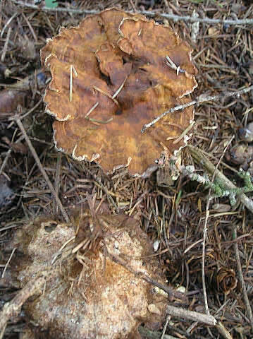小型菌「肉桂茸」の和名。肉桂色をしているのが和名の由来。傘は放射状の繊維状で絹糸状光沢と環紋がある