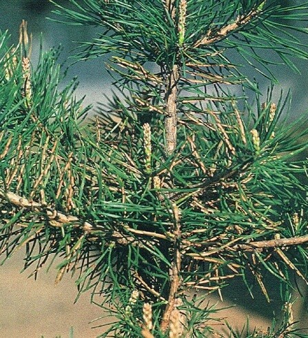 しゅ子嚢(さび胞子世代)は針葉上に生じ、橙黄色~黄白色で長さ2mmm内外、幅0,5~1,5mm。