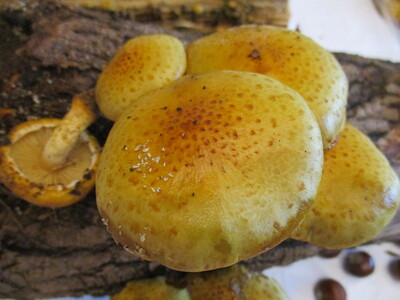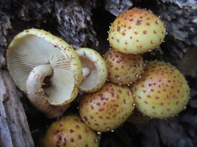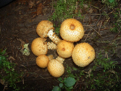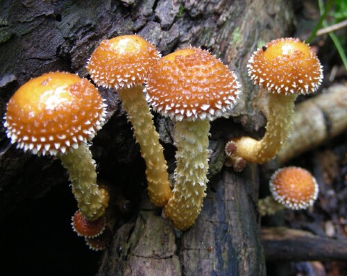 傘と柄にぬめりがあり、ナメコの近縁種。傘は三角形に尖った鱗片に覆われ、柄も鱗片状なのが特徴