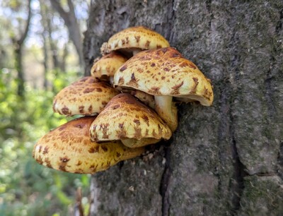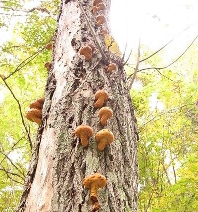 春から秋に木の幹に生えてよく目立つ茶色のきのこ、大きさは中型~大型