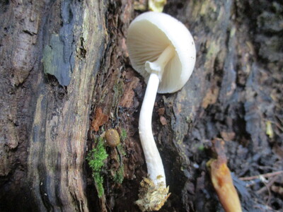 傘裏面はヒダ状で白色、並び方はやや疎~疎で柄に直生~やや上生する。