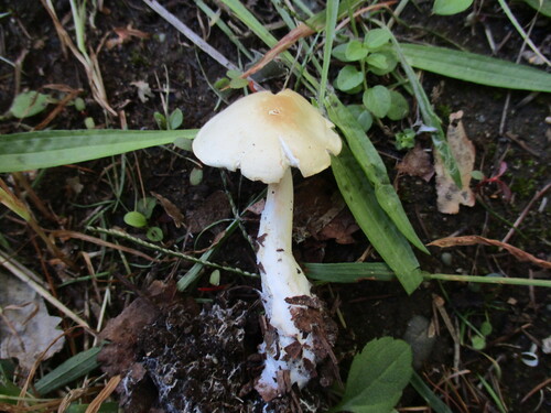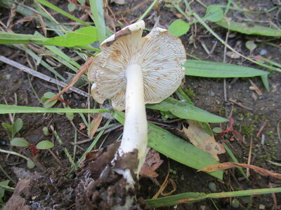 中型菌「灰黄土瘤胞子茅茸」和名。星野保農学博士が胞子観察を致して同定。根元の土中に白色菌糸が多数有る