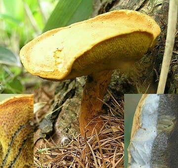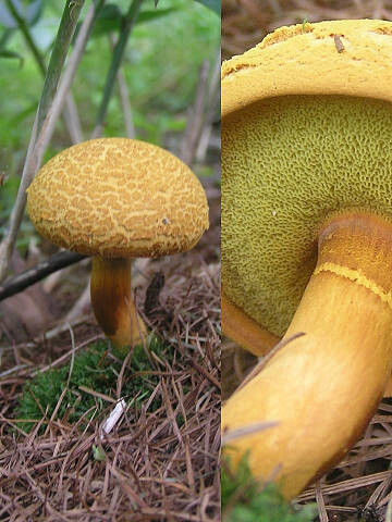 中型~大型菌。「黄苦猪口」の和名はニガイグチ属の黄色いきのこという意味で、苦く無いのが特徴。