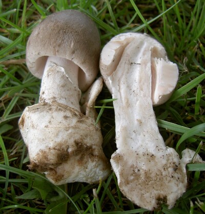 傘は灰褐色で条線があり、ヒダは淡紅色、柄は白色でつばがあり、根元に厚膜質のつぼがあるのが特徴。