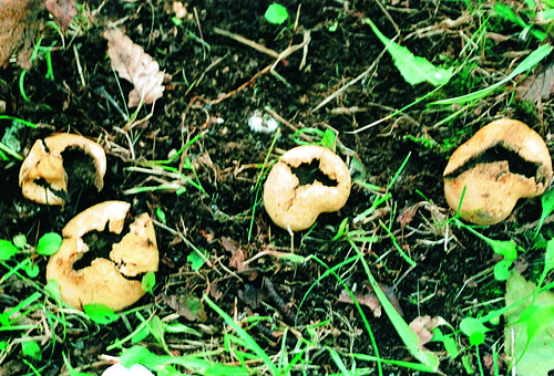 子実体:直径2~5(8)cm程の小型で頭部は類球形、表皮は厚く、淡黄色で亀甲状のひび割れが入り、亀甲の端が浮いて薄皮のように見える部位もあり、傷がつくとすぐに濃い紫や茶色に変色する。