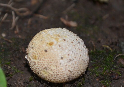 中型~やや大型菌「玉脳茸」和名。ホコリタケの仲間に似ず大型となり表面の疣は先端が尖がらないのが特徴。