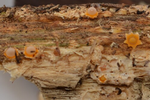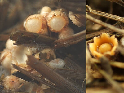 子実体:1mm~3mmの非常に小さいキノコで白色~淡黄白色の類球形、殻皮は成熟すると6~10片の星形に裂開し、内部は明るい黄色、その内部の中央に担子器を持つ直径1mmの黄色い粘球体がある、この粘球体を弾き出して胞子を拡散します。