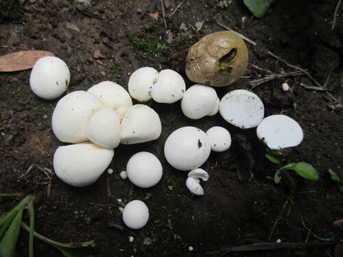 「チビ埃茸」和名通り、小型の類円形で幼菌時の白色~成熟してベージュ色となり、無性基部が無いのが特徴。