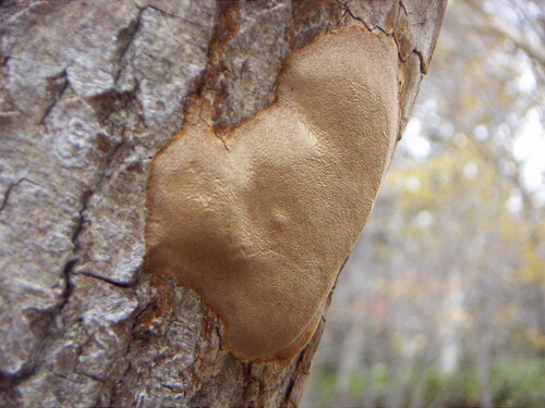 発生環境:早春~晩秋。広葉樹と針葉樹の材に発生する全背着生。多年生。(木材白色腐朽菌)ナシ萎縮病やスギ非赤枯性溝腐病などの病原として知られている。