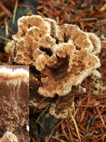 傘裏、子実層面:乳首状の疣を多数つくり、傘表面よりも淡色。
