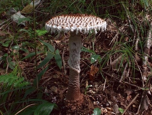 傘は饅頭形で角状鱗片に覆われる。柄は傘とほぼ同色で上部につばがあり、下方はささくれ状で根元は膨らむ。