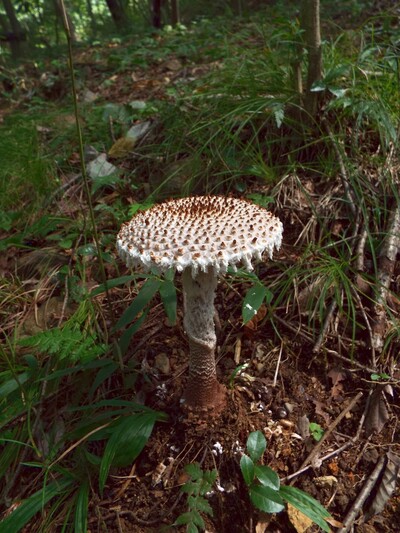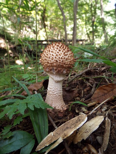 柄:長さ20~24cm程で傘とほぼ同色。ささくれ鱗片に覆われれ、傷つけると暗褐色になる。上部のつばは早落性。根本は鬼茎状に膨らみ疣状突起をを付着。内部は中実~髄状。