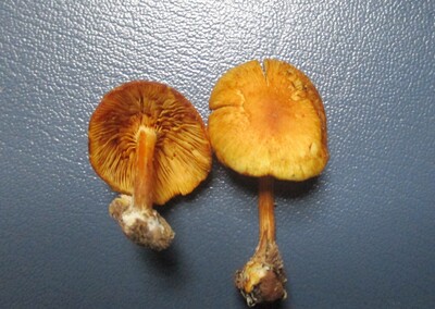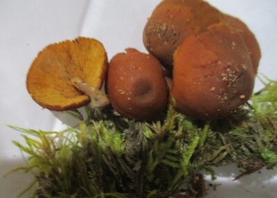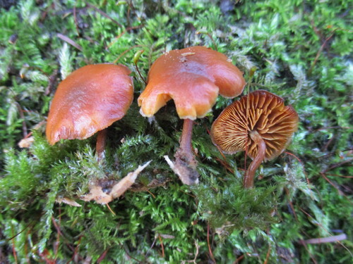 傘は饅頭形、表面は橙褐色で平滑、大きさはしばしば直径5cm程のやや中型となることがある。