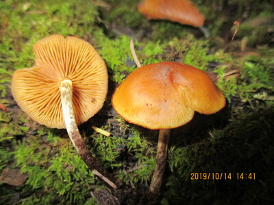 傘:直径2~4cm程の小型で釣鐘形~饅頭形~ほぼ平らに開く。表面は橙褐色~黄褐色~茶褐色で中央は濃い、古くなると周辺に多少の条線をあらわす。