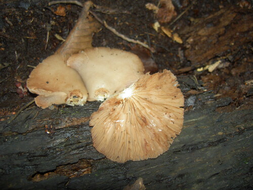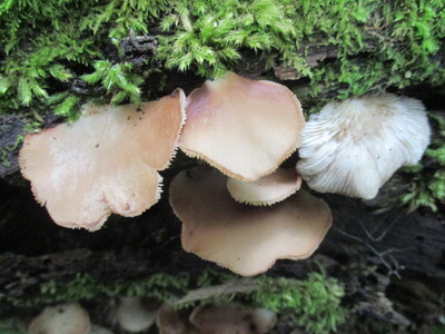 小型~やや中型菌「茶平茸」和名通り、傘は淡い茶色で薄っすらと条線がり、柄がないのが特徴。