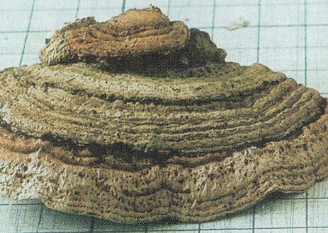 傘:直径2~8cm程で奥ゆき5cm程、厚さ1cm以下の中型で半円形~棚状。無柄で側着生。表面は茶褐色~灰褐色で黒色の環溝や灰褐色の環紋がある。