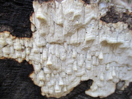 子実体:不定形に広がる背着生で張り付くように形成され、沢山の傘を作る。