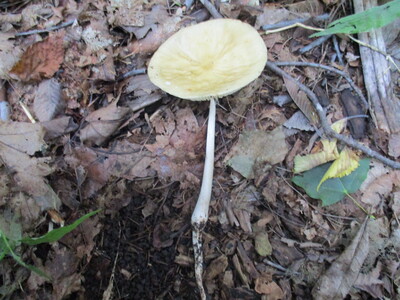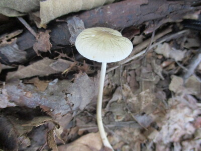 柄:長さ5~12cm程で細長い。傘とほぼ同色で軟骨質。下部がやや太くなり、地面直下で一番太くなる。地面下では少しづつ細まって地中にある腐木など基物まで深く根状に伸びる。内部は中空。