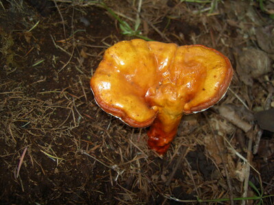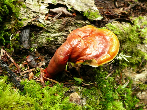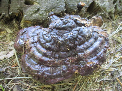 「栂万年茸」マンネンタケの名ですが一年生。表面はうるし塗り様の光沢や胞子の粉がでたりするのが特徴。