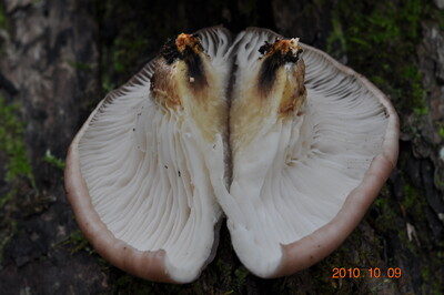 傘裏面:ヒダ状で白色~クリーム色、比較的幅広、暗所でほんのり発光する。並び方は密で柄に垂生する。