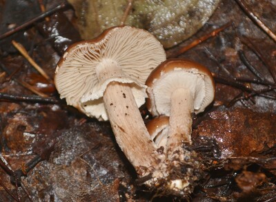 ヒダは淡褐色。柄は帯白色で基部から褐色を帯び下同径で縦の繊維紋があり、つばの上面に条線があるのが特徴