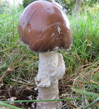 帯灰茶色の傘はぬめりがある。柄の上部に消失しやすいつばがあり、下方は白色~淡黄色の綿状鱗片に覆われる