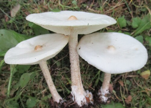 中型菌「粒柄占地」和名通り、柄に粒状の隆起が有り、傘は白色で中央部に帯褐色の中丘をもつのが特徴。