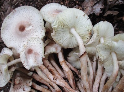 小型~大型菌「粒唐傘茸」傘と柄は白色地に褐色の粒状鱗片鱗をつけ、傷付くと赤変するのが最大の特徴。