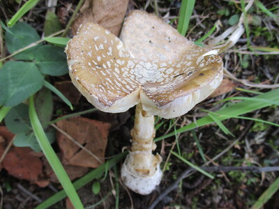 中型~大型菌「天狗茸」和名由来は子実体の柄が長いことを天狗の鼻に例えたよう。疣が扁平なのが特徴。
