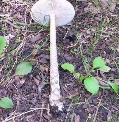 柄:長さ9~13cm程で淡灰色地に灰色の綿クズ状鱗片に密に覆われる。根元は灰黒褐色で崩れやすい綿質のツボが不完全な輪状になって残る。内部は中空。