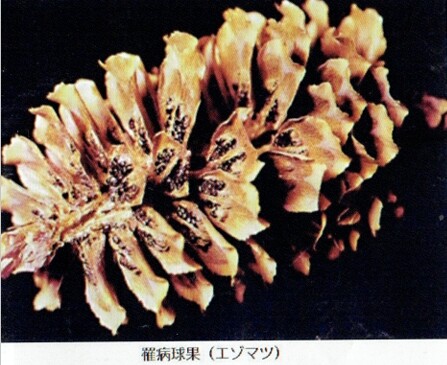 子実体:球果の鱗片に直径1mm程の非常に小さい黒粒状物を形成する。