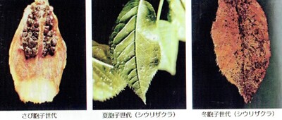 夏胞子と冬胞子世代はシウリザクラの葉に形成する。