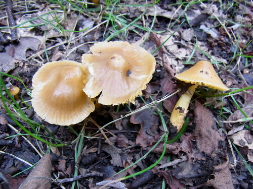 小型菌「株偽風船茸」サザナミニセフウセンタケに似るが、傘表面が微毛状で無く平滑で黄褐色~黄土色です