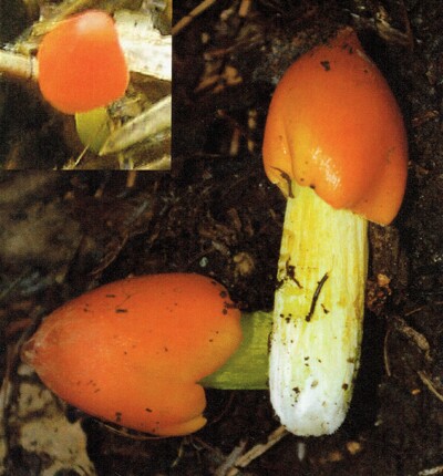 *類似のシュイロガサは、傘は直径5㎝程迄で饅頭形~浅杯形、粘性なく鮮朱色(橙赤色)で中央より黄色に退色し、縁に短い条線がある。