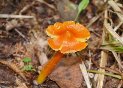傘は中央が尖った平らに開き、縁が不規則に曲がることが多い。鮮やかな橙赤色が美しい!!