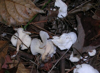 トキイロラッパタケは、傘や柄が朱鷺色~淡黄色~白色など変化があり、傘縁は花びらの様なのも特徴。