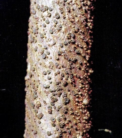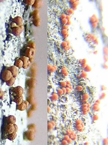 子実体:樹木の表皮より突出し直径1mm前後の非常に小さい円形~盤状の子のう盤が形成される。表面は初め黄色~黄褐色の粉状物に覆われるが、成熟すると黒色となって形成される。