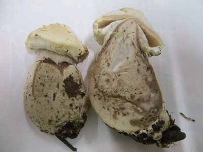 柄:長さ5~10cm程で傘より淡色~ほぼ同色で上部につばがあり、下方は茶褐色のささくれがある。根元は紡鐘形に膨らみ、その先は根状に長く伸びて地下部が6~25cm程になるようです。内部は中実。
