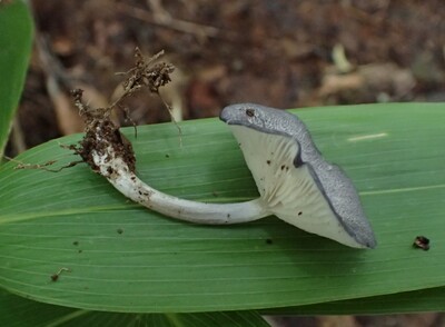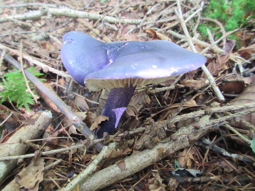 *類似のコンイロイッポンシメジは、傘は濃青黒色の繊維状。柄は白色地に濃青黒色の縦線があるので区別できる。