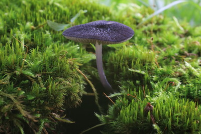 中型菌「茄子紺一本湿地」名の通り、ナスを思わせる濃紺色で一本での発生が多い。傘と柄は細鱗片に覆われる