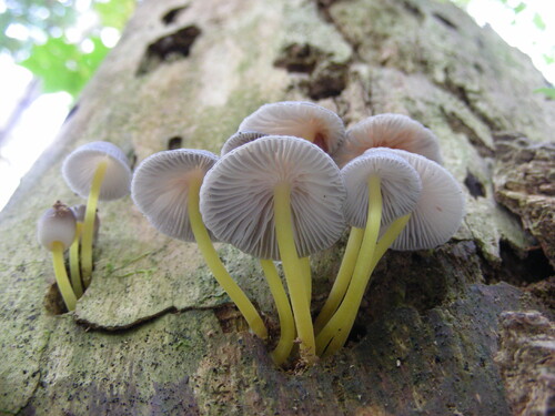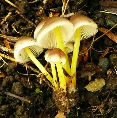 柄:長さ3~7cm程で細長い、鮮黄色~徐々に色あせて帯褐色となり、湿時粘性で乾くと光沢があり、根元に白毛を密生する。内部は中空。