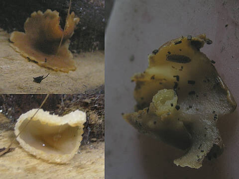 椀の内側は類白色~帯褐色で子実層がある。外側は帯白色で粉状。