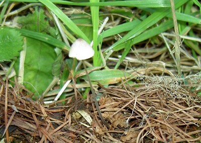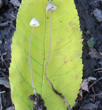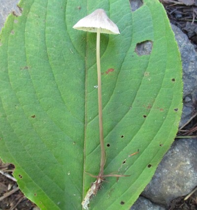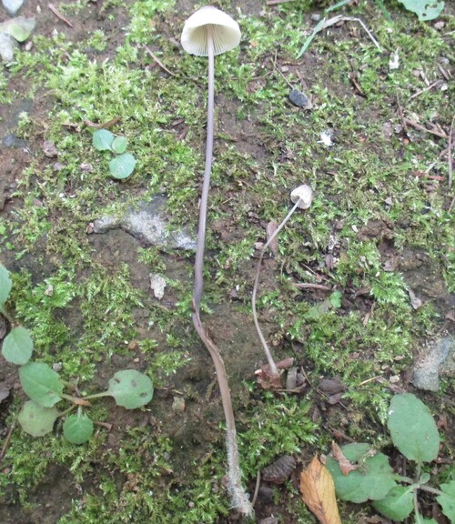 小型菌「臭脚長茸」ヨードホルム様の匂いを発することから付いた和名。細長い柄の根本に白毛があるのが特徴