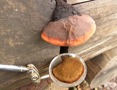 肉:さび褐色~こげ茶色で堅いコルク質、厚さ5cm程になり、アニス臭やミカンのような独特の良い香りがする。