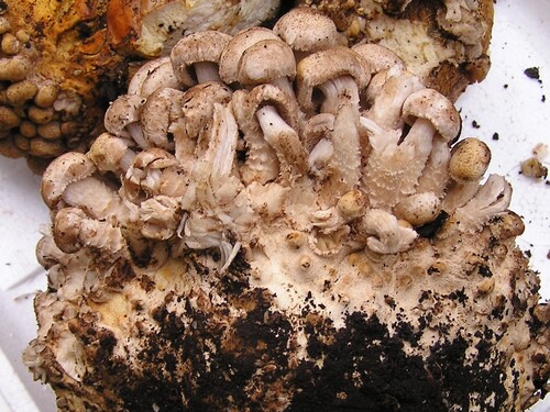 子実体はコガネタケに寄生して黄色い塊(菌糸塊)を作り、株状に沢山発生する。