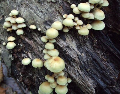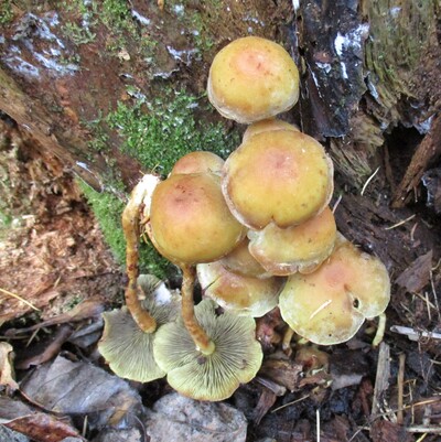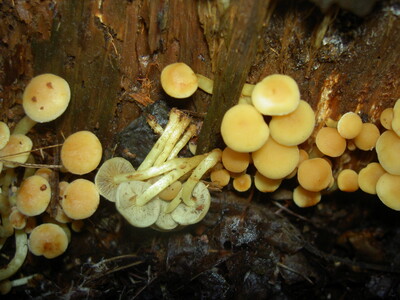 傘色は鮮黄色~淡褐色でニガクリタケにそっくりですが、針葉樹の落枝や倒木、切り株などに発生する。
