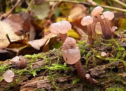 小形菌「膠頭巾茸」和名。全体がゼラチン質~膠質。本種はズキンタケ属では無く、オムブロフィラ属です。